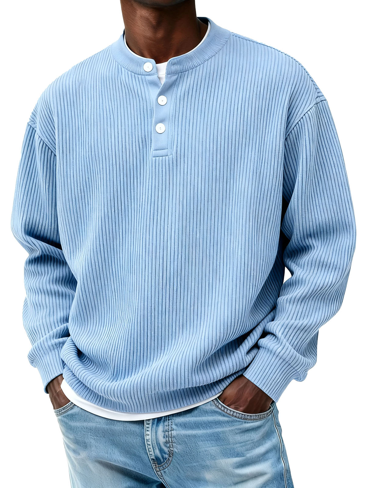 Men's Casual Pit Strip Fabric Three-button Long-sleeved Henry Shirt