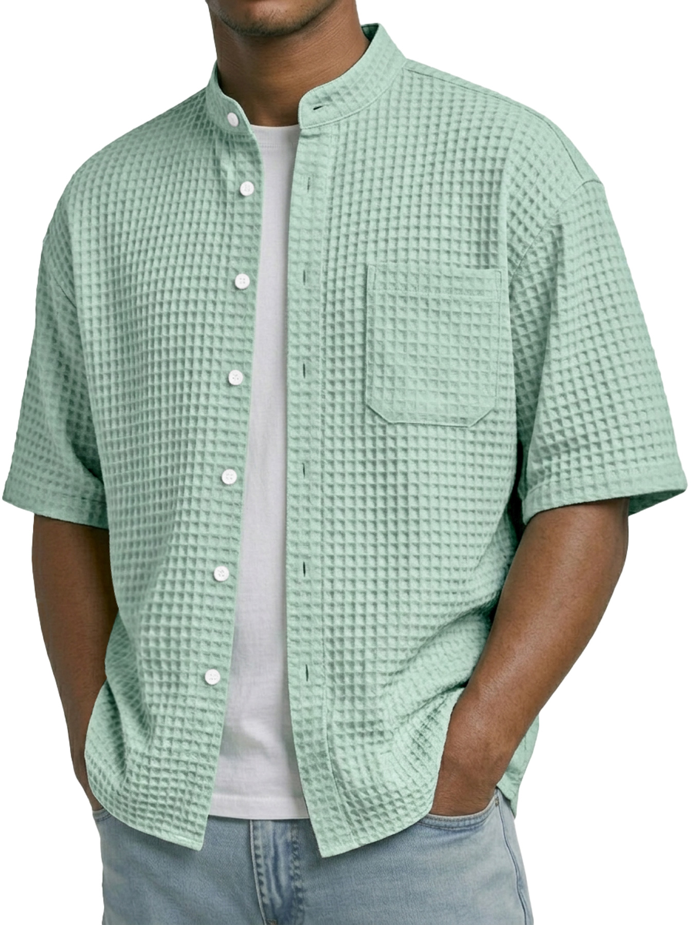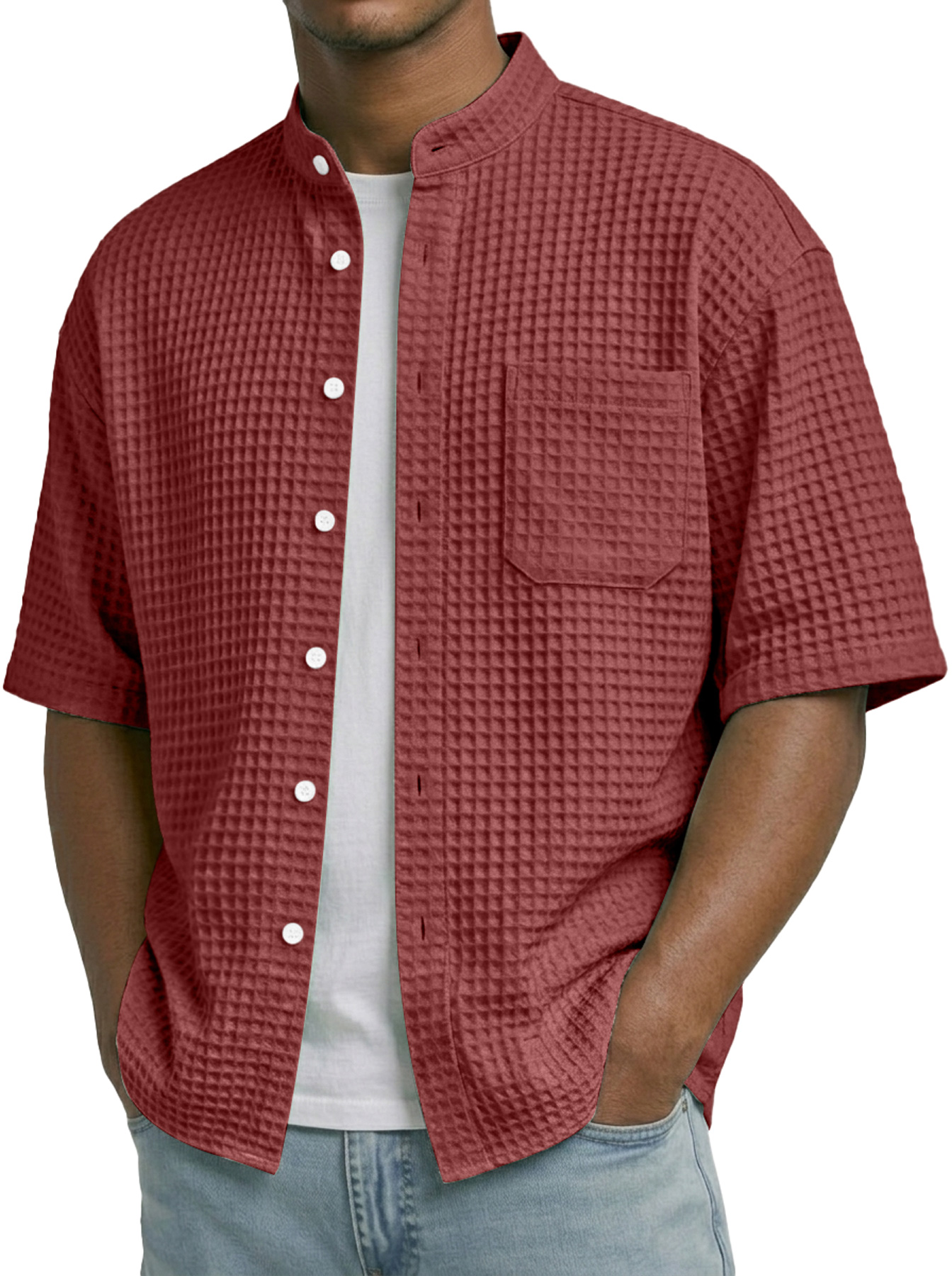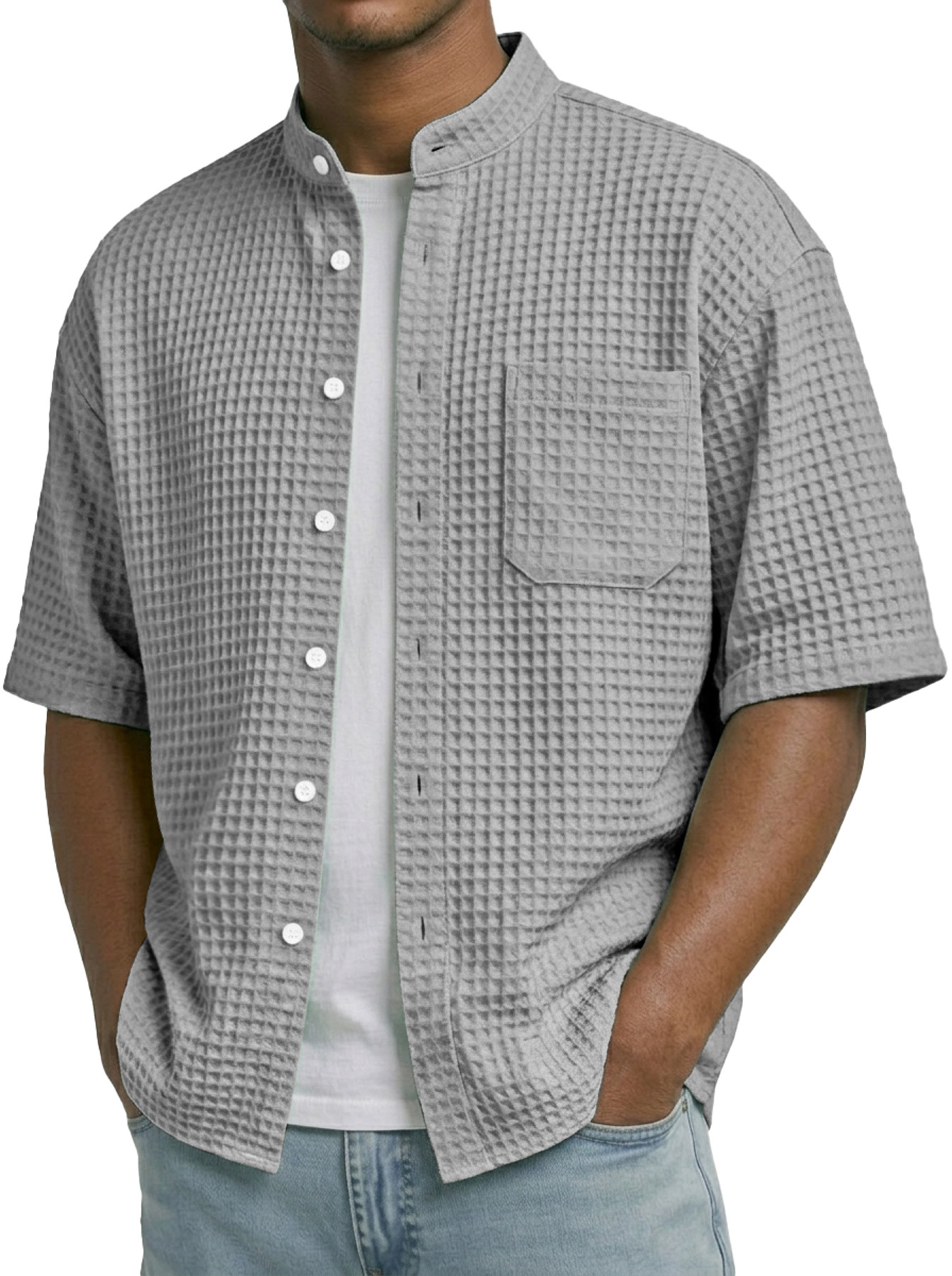 Men's Waffle Collar Stand Collar Pocket Casual Short-Sleeve Shirt